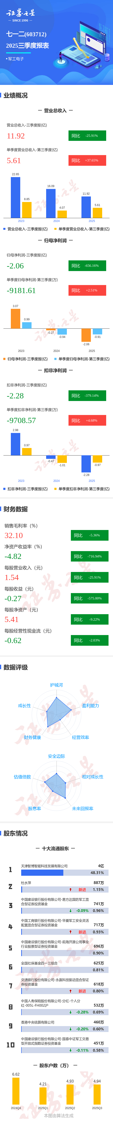 证券之星消息,七一二2025年三季报显示,前三季度公司主营收入11.92亿元,同比下降25.92%;归母净利润-2.06亿元,同比下降656.16%;扣非净利润-2.28亿元,同比下降379.15%;其中2025年第三季度,公司单季度主营收入5.61亿元,同比上升37.65%;单季度归母净利润-9181.61万元,同比上升2.51%;单季度扣非净利润-9708.57万元,同比上升4.68%;负债率52.01%,投资收益488.39万元,财务费用1803.22万元,毛利率32.1%。