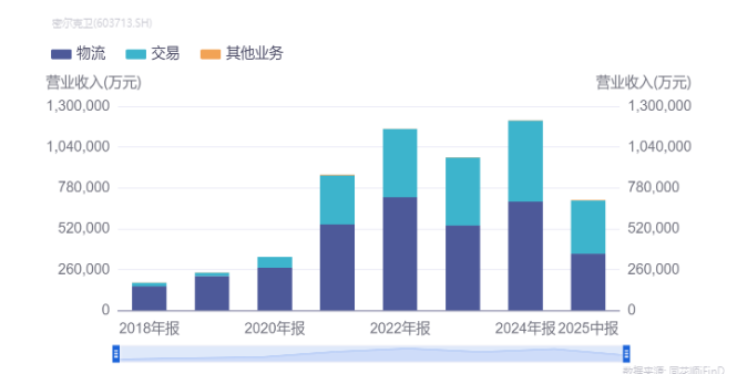 仅依靠物流业务,难以支撑公司业绩进一步增长,交易业务成为重要补充与增长引擎。自2018年公司上市时起,交易业务的营收稳步提升。2025年上半年,交易业务营收占比已达48.08%,几乎与物流主业(51.39%)平分秋色。