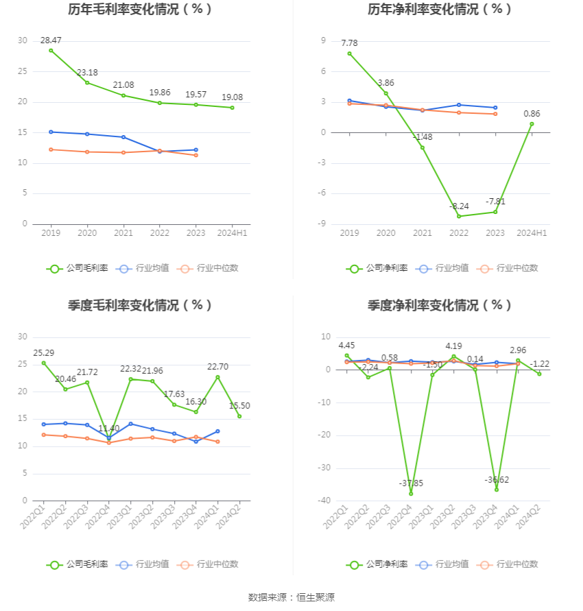 2024年上半年,公司毛利率为19.08%,同比下降3.04个百分点;净利率为0.86%,较上年同期下降0.83个百分点。从单季度指标来看,2024年第二季度公司毛利率为15.50%,同比下降6.46个百分点,环比下降7.20个百分点;净利率为-1.22%,较上年同期下降5.41个百分点,较上一季度下降4.18个百分点。