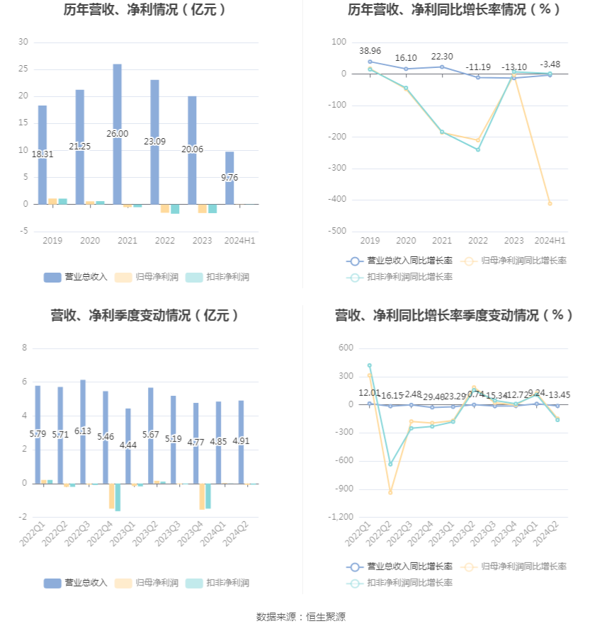 根据半年报,公司第二季度实现营业总收入4.91亿元,同比下降13.45%,环比增长1.12%;归母净利润-792.93万元,同比下降148.24%,环比下降351.18%;扣非净利润-688.0万元,同比下降163.30%,环比下降856.28%。