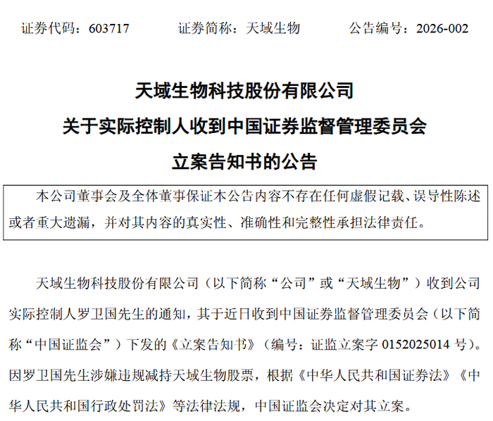 中新经纬12月31日电 天域生物科技股份有限公司(下称“天域生物”)12月31日发布公告称,公司实际控制人罗卫国被立案。