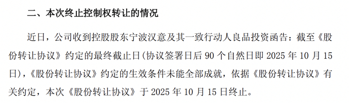 10月16日,良品铺子(SH603719)公告,近日,公司收到控股股东宁波汉意及其一致行动人良品投资函告:截至《股份转让协议》约定的最终截止日(协议签署日后90个自然日即2025年10月15日),《股份转让协议》约定的生效条件未能全部成就,依据《股份转让协议》有关约定,本次《股份转让协议》于2025年10月15日终止。