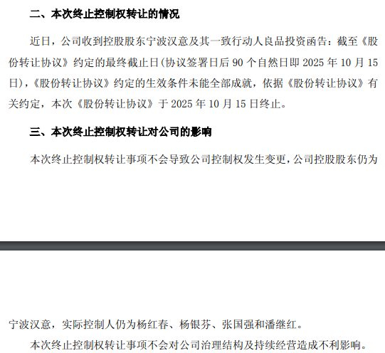 10月16日晚,良品铺子发布公告显示,控股股东宁波汉意创业投资合伙企业(有限合伙)(以下简称“宁波汉意”)及其一致行动人良品投资公告,此前与武汉长江国际贸易集团有限公司(以下简称“长江国贸”)签署的《股份转让协议》因约定的生效条件未能在最终截止日(2025年10月15日)前全部满足,协议已于10月15日终止。