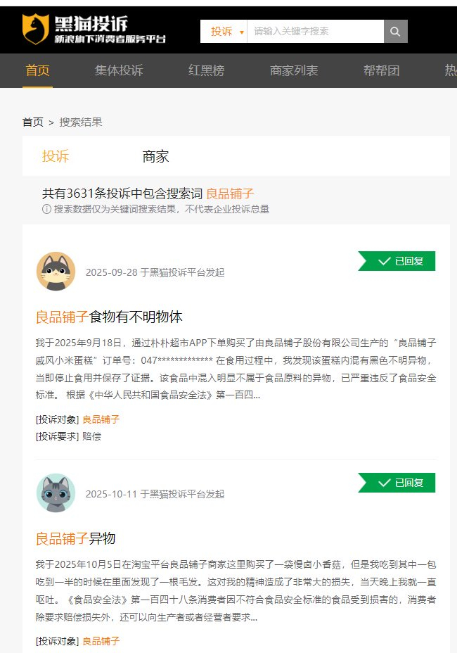 根据公开的消息检索,仅2025年,良品铺子的投诉量就达到3524件,居行业首位。其中异物混入、发霉变质是核心问题所在。