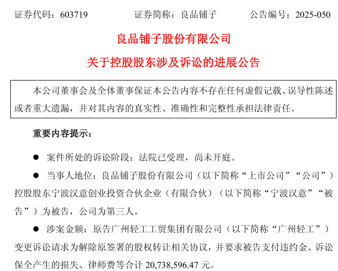 公告显示,良品铺子控股股东宁波汉意创业投资合伙企业(有限合伙)(下称“宁波汉意”)为被告,良品铺子为第三人。涉案金额方面,广州轻工要求宁波汉意支付违约金、诉讼保全产生的损失、律师费等合计2073.86万元。