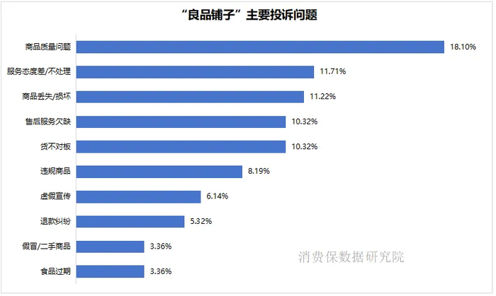 消费保1900条投诉里,良品铺子以32.26%的投诉占比位居榜首,三只松鼠、百草味紧随其后,Top3品牌占据总投诉量近六成。