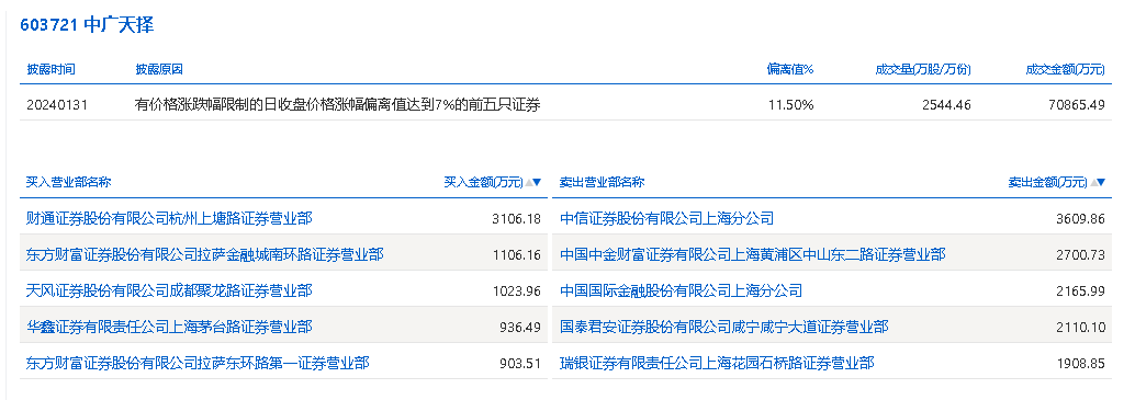 1月31日,中广天择今日涨停,龙虎榜数据显示,上榜营业部席位全天成交1.96亿元,占当日总成交金额比例为27.62%。其中,买入金额为7076.3万元,卖出金额为1.25亿元,合计净卖出5419.24万元。