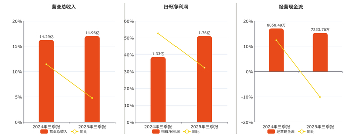 公司营业总收入为14.96亿元。归母净利润为1.76亿元。经营活动现金净流入为7233.76万元,在已披露的同业公司中排名第19,较去年同报告期经营活动现金净流入减少824.73万元,同比较去年同期下降10.23%。