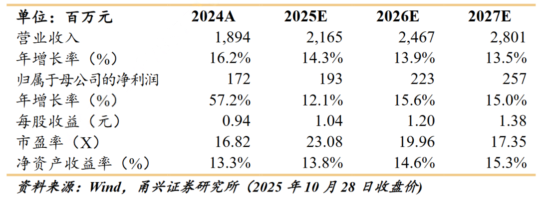 我们认为,公司深耕空调风叶、机械风机主业,客户结构优质,新建泰国生产基地,有望开拓海外市场;积极推进风机模块化战略,打造选型平台,快速适配暖通空调、空净、储能、算力中心等应用场景;复合材料顺利导入轻量化、免喷涂应用,有望受益于自主品牌汽车崛起、新能源汽车产销增长,有望实现收入增长;公司自研机器人关节模组可适配协作机器人、人形机器人,未来有望导入商业化应用;公司通过对外投资,积极布局新材料、高端精密制造等新兴行业,其中包括对甬矽电子、长鑫存储、宁波聚嘉的投资。我们预计公司2025-2027年营业收入分别为21.65 / 24.67 / 28.01亿元。YOY + 14.3% / 13.9% / 13.5%, EPS为1.04 / 1.20 / 1.38元 / 股,截至2025年10月28日收盘,对应PE为23.08 / 19.96 / 17.35。首次覆盖,给予“增持”评级。