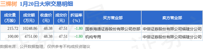 1月20日三棵树现2笔大宗交易 机构净买入4751万元