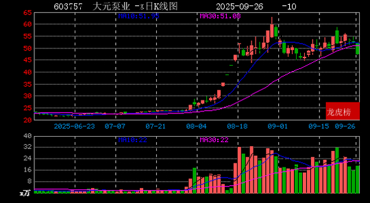 截止收盘,大元泵业报收47.33元/股,涨幅-10.0%,成交量18万手,成交额9.27亿元,换手率10.12%。今日未涨停。