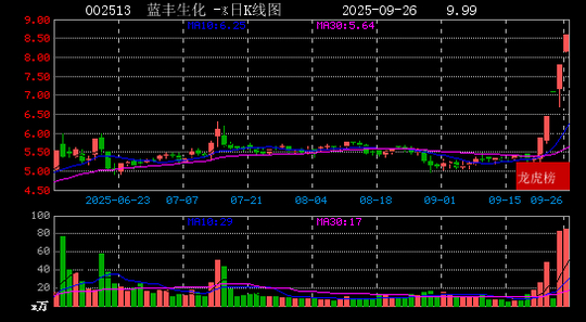 截止收盘,蓝丰生化报收8.59元/股,涨幅9.99%,成交量85万手,成交额7.22亿元,换手率32.21%。今日5板。