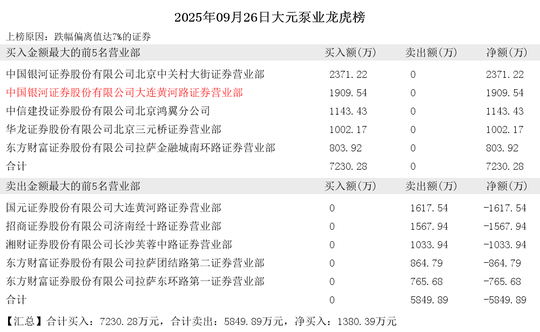 买入前5席为:中国银河证券股份有限公司北京中关村大街证券营业部、中国银河证券股份有限公司大连黄河路证券营业部、中信建投证券股份有限公司北京鸿翼分公司、华龙证券股份有限公司北京三元桥证券营业部、东方财富证券股份有限公司拉萨金融城南环路证券营业部。共计买入:7230.28万元,共计卖出:0万元。