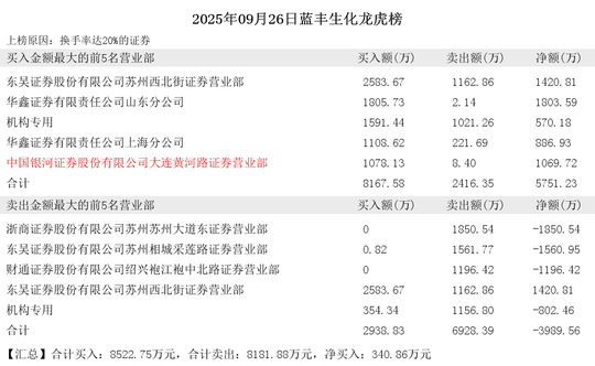 买入前5席为:东吴证券股份有限公司苏州西北街证券营业部、华鑫证券有限责任公司山东分公司、机构专用、华鑫证券有限责任公司上海分公司、中国银河证券股份有限公司大连黄河路证券营业部。共计买入:8167.58万元,共计卖出:2416.35万元。