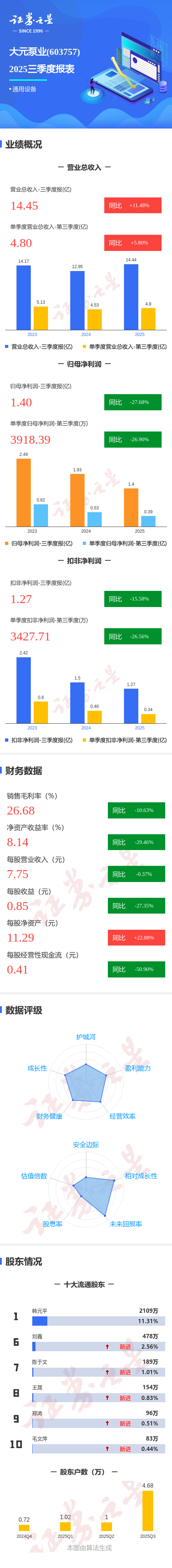 图解大元泵业三季报:第三季度单季净利润同比下降26.91%