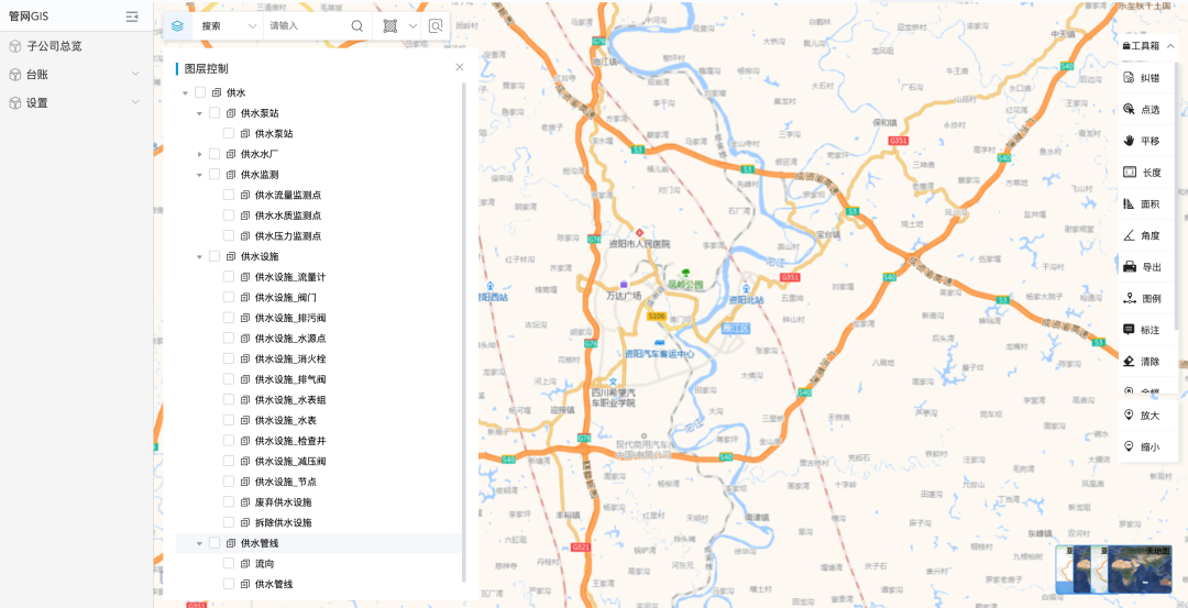 【地理信息GIS系统:一套强大的工具,它结合了电脑、地图和地理等知识,可以收集、整理、查看和分析地球上各种事物的位置信息。对水务企业而言,利用GIS可对管线及各种设施进行查询、定位,完成后台定性、定量的统计及分析,进而第一时间为爆管、漏水事故的抢修、维修提供关闸方案,实现管网的信息化管理,提高管网管理工作的效率和质量。】