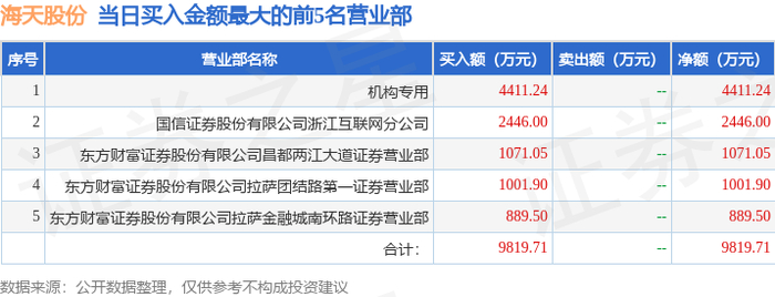 11月10日海天股份(603759)龙虎榜数据:机构净买入4411.24万元