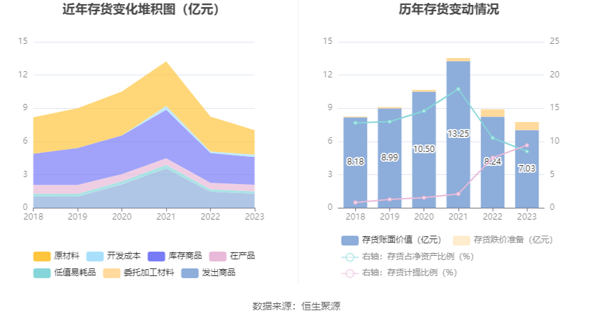 从存货变动来看,截至2023年年末,公司存货账面价值为7.03亿元,占净资产的8.51%,较上年末减少1.22亿元。其中,存货跌价准备为7318.07万元,计提比例为9.43%。