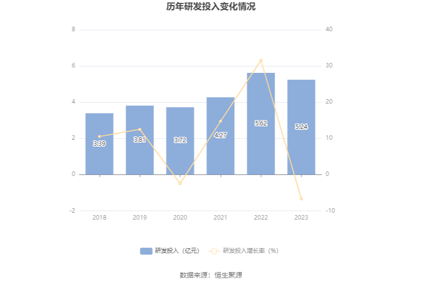 2023年全年,公司研发投入金额为5.24亿元,同比下降6.71%;研发投入占营业收入比例为4.01%,相比上年同期下降0.52个百分点。此外,公司全年研发投入资本化率为12.77%。