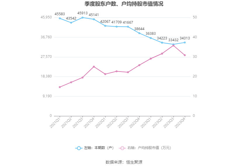 筹码集中度方面,截至2023年年末,公司股东总户数为3.43万户,较三季度末增长了881户,增幅2.64%;户均持股市值由三季度末的35.81万元下降至30.88万元,降幅为13.77%。