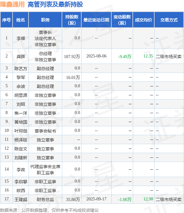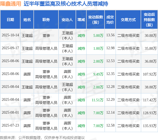 证券之星消息,根据10月16日市场公开信息、上市公司公告及交易所披露数据整理,隆鑫通用(603766)最新董监高及相关人员股份变动情况:2025年10月14日公司董事王建超共减持公司股份5.0万股,占公司总股本为0.0024%。变动期间公司股价上涨1.42%,10月14日当日收盘报13.55元。