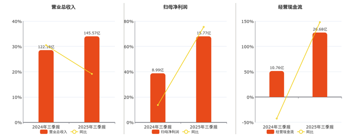 公司营业总收入为145.57亿元。归母净利润为15.77亿元。经营活动现金净流入为26.68亿元。