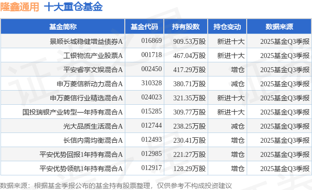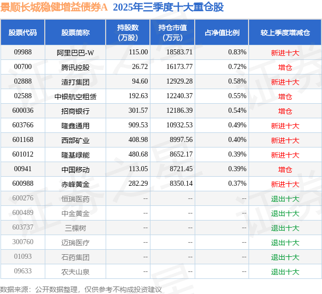 根据2025基金Q3季报公募基金重仓股数据,重仓该股的公募基金共51家,其中持有数量最多的公募基金为景顺长城基金的景顺长城稳健增益债券A。景顺长城稳健增益债券A目前规模为94.72亿元,最新净值1.1563(11月18日),较上一交易日下跌0.22%,近一年上涨8.26%。该公募基金现任基金经理为彭成军。彭成军在任的基金产品包括:景顺长城景泰盈利纯债,管理时间为2020年9月12日至今,期间收益率为25.17%;景顺长城景泰裕利纯债债券A,管理时间为2020年9月12日至今,期间收益率为21.09%;景顺长城景泰恒利一年定开债,管理时间为2021年1月8日至今,期间收益率为17.49%;景顺长城中短债A,管理时间为2021年2月6日至今,期间收益率为14.75%。