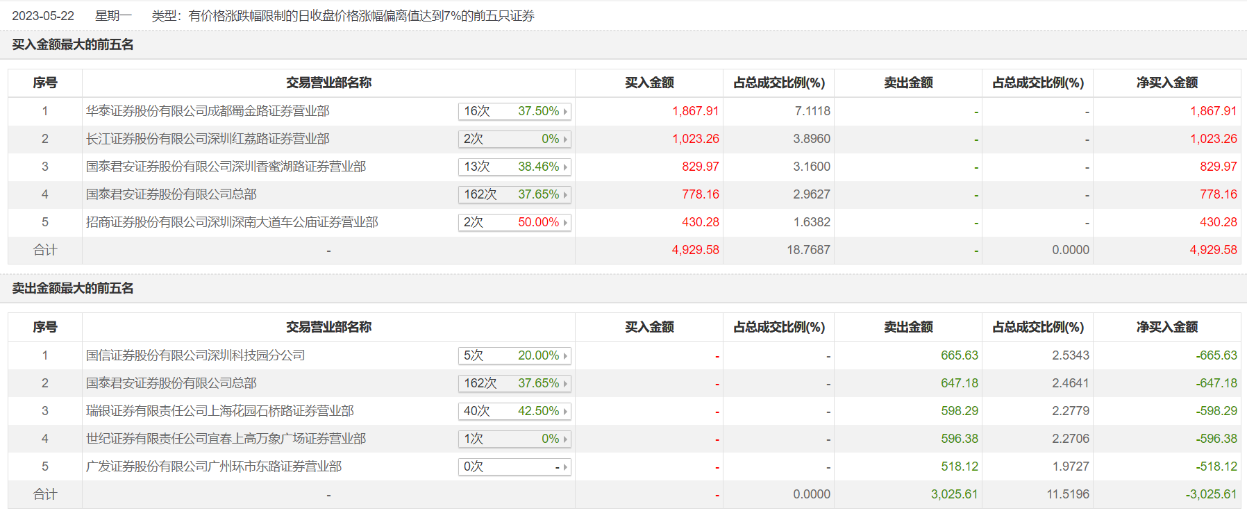 具体来看,华泰证券成都蜀金路证券营业部、长江证券深圳红荔路证券营业部分别买入1867.91万元、1023.26万元;国信证券深圳科技园分公司、国泰君安证券总部分别卖出665.63万元、647.18万元。