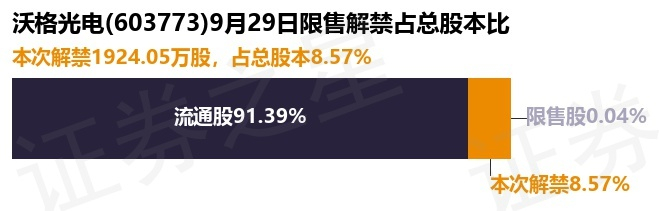 沃格光电(603773)1924.05万股限售股将于9月29日解禁,占总股本8.57%
