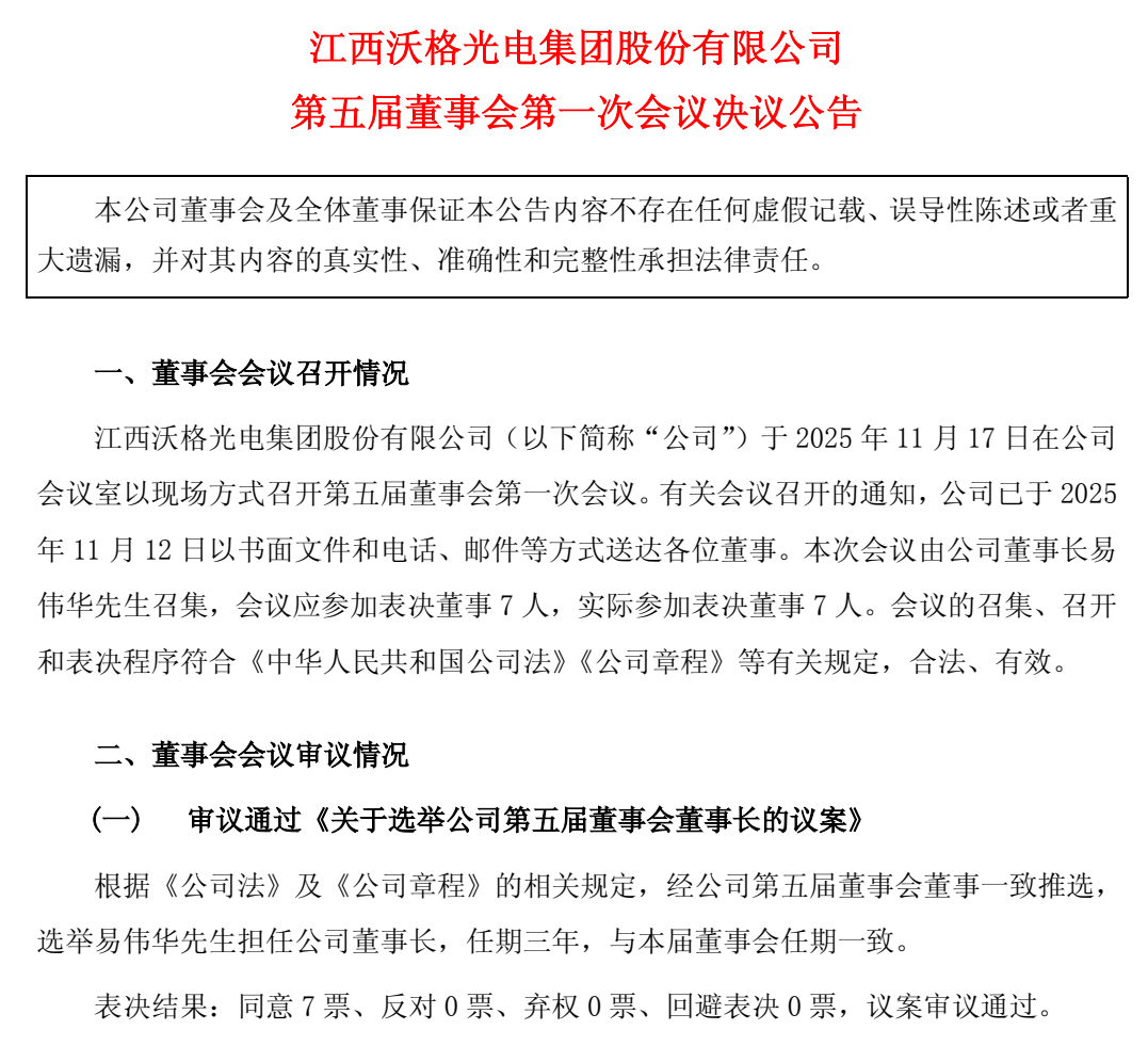 11月17日晚间沃格光电发布公告称,公司第五届第一次董事会会议于2025年11月17日在公司会议室以现场方式召开。会议审议了《关于选举公司第五届董事会董事长的议案》、审议通过《关于选举公司第五届董事会专门委员会委员及主任委员的议案》、审议通过《关于聘任公司总经理的议案》等文件。