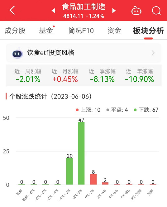 中国经济网北京6月6日讯 今日,食品加工制造板块整体跌幅1.24%,其中,10只股票上涨,4只股票平盘,67只股票下跌。