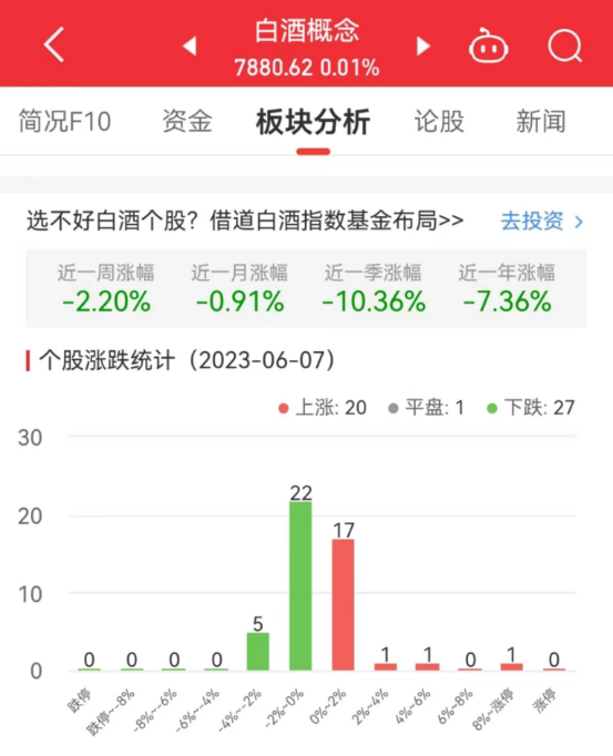 中国经济网北京6月7日讯今日,白酒概念板块整体涨幅0.01%,其中20只股票上涨,1只股票平盘,27只股票下跌。