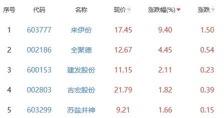 其中,来伊份、全聚德、建发股份、吉宏股份、苏盐井神位列板块涨幅前五位,涨幅分别为9.40%、4.45%、2.11%、1.82%、1.66%。