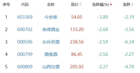 今世缘、舍得酒业、古井贡酒、酒鬼酒、山西汾酒位列涨幅榜后五位,涨幅分别为-3.89%、-2.60%、-2.59%、-2.56%、-2.27%。
