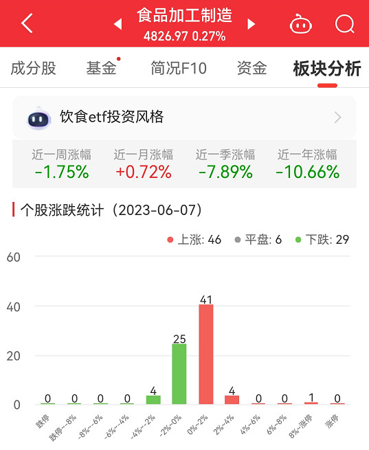 中国经济网北京6月7日讯 今日,食品加工制造板块整体涨幅0.27%,其中,46只股票上涨,6只股票平盘,29只股票下跌。