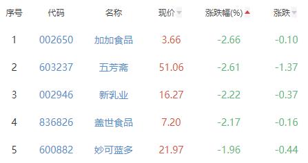 加加食品、五芳斋、新乳业、盖世食品、妙可蓝多位列涨幅榜后五位,涨幅分别为-2.66%、-2.61%、-2.22%、-2.17%、-1.96%。