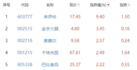 其中,来伊份、金字火腿、麦趣尔、千味央厨、巴比食品位列板块涨幅前五位,涨幅分别为9.40%、3.45%、2.57%、2.49%、2.22%。