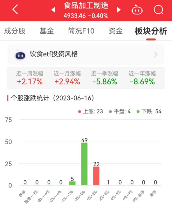 中国经济网北京6月16日讯今日,食品加工制造板块整体跌幅0.40%,其中23只股票上涨,4只股票平盘,54只股票下跌。