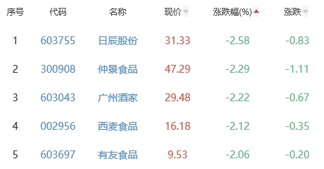 日辰股份、仲景食品、广州酒家、西麦食品、有友食品位列涨幅榜后五位,涨幅分别为-2.58%、-2.29%、-2.22%、-2.12%、-2.06%。