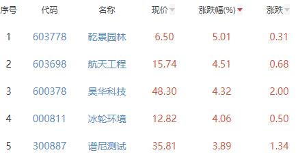 其中,乾景园林、航天工程、昊华科技、冰轮环境、谱尼测试位列板块涨幅前五位,涨幅分别为5.01%、4.51%、4.32%、4.06%、3.89%。