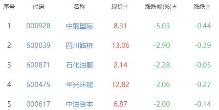 中钢国际、四川路桥、石化油服、华光环能、中油资本位列涨幅榜后五位,涨幅分别为-5.03%、-2.90%、-2.28%、-2.06%和-2.00%。