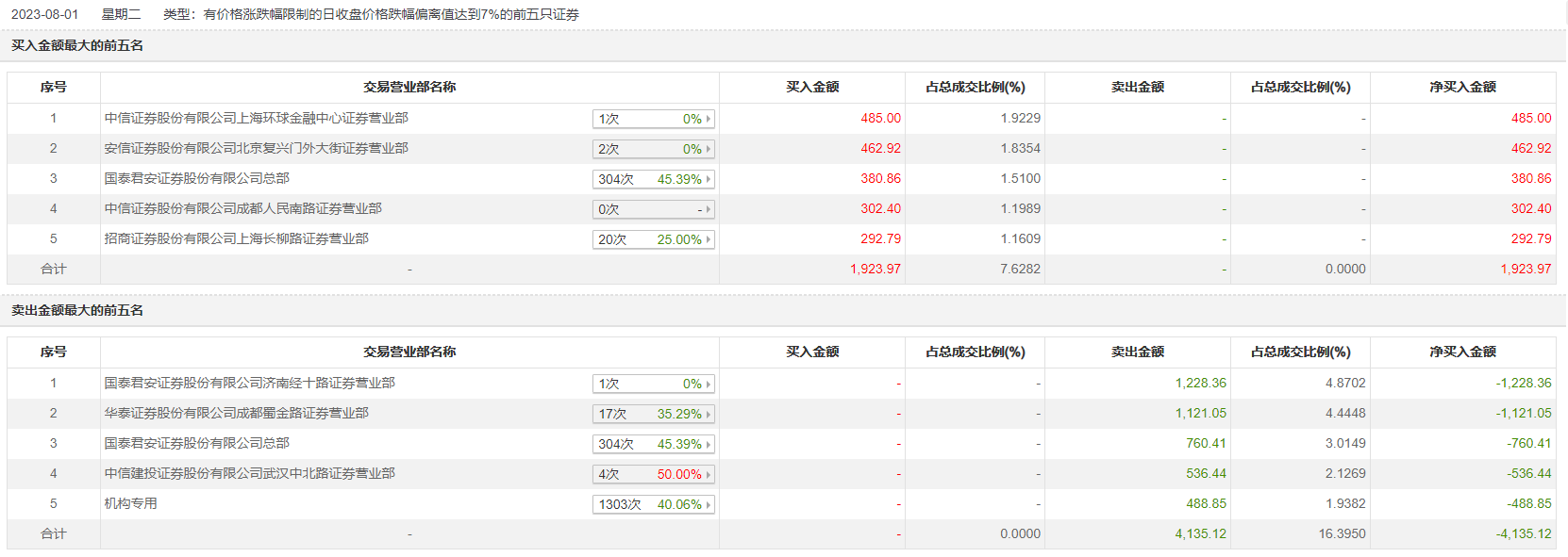 8月1日,乾景园林今日跌停,龙虎榜数据显示,上榜营业部席位全天成交6059.1万元,占当日总成交金额比例为24.02%。其中,买入金额为1923.97万元,卖出金额为4135.12万元,合计净卖出2211.15万元。