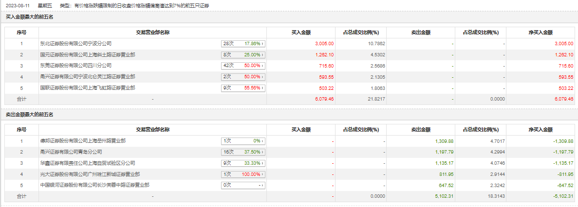 8月11日,乾景园林今日涨停,全天换手率达7.21%,振幅达1.65%。龙虎榜数据显示,营业部席位合计净买入977.16万元。其中,东北证券宁波分公司、国元证券上海斜土路证券营业部分别买入3005.00万元、1262.10万元;德邦证券上海岳州路营业部、甬兴证券有限公司青岛分公司分别卖出1309.88万元、1197.79万元。