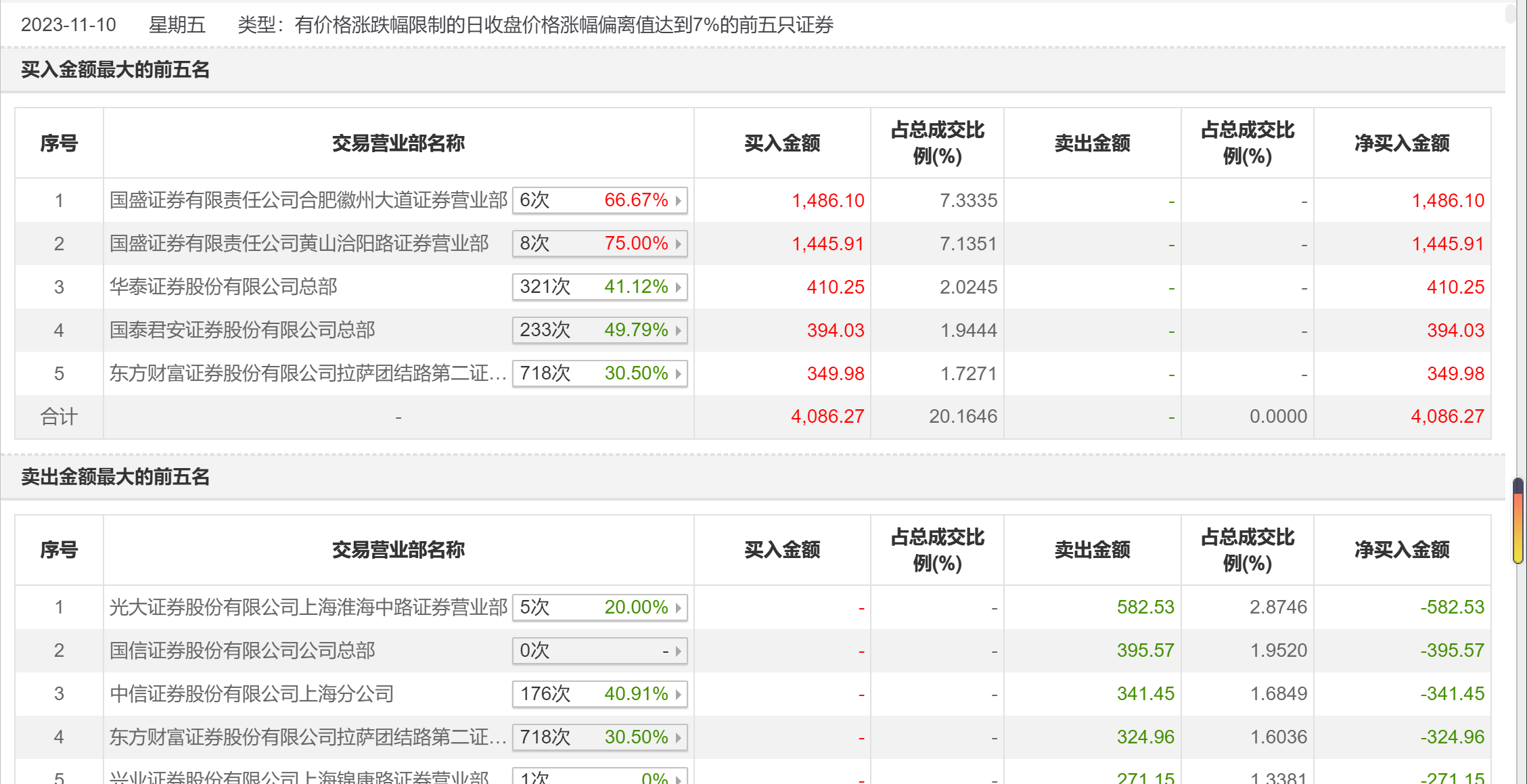 11月10日,乾景园林今日涨停,全天换手率达5.86%,振幅达10.24%。龙虎榜数据显示,营业部席位合计净买入2170.61万元。其中,国盛证券合肥徽州大道证券营业部、国盛证券黄山洽阳路证券营业部分别买入1486.10万元、1445.91万元;光大证券上海淮海中路证券营业部、国信证券公司总部分别卖出582.53万元、395.57万元。