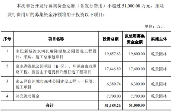 乾景园林2018年披露的2018年非公开发行A股股票预案(三次修订稿)显示,本次定增募集资金净额将用于投资以下项目:(1)多巴新城湟水河扎麻隆湿地公园景观工程设计、采购、施工总承包项目;(2)泉水湖湿地公园项目(B区)、环湖路市政道路工程、园区主干道提档升级打造工程项目;(3)密云区白河城市森林公园建设工程(一标段)施工项目;(4)补充流动资金。