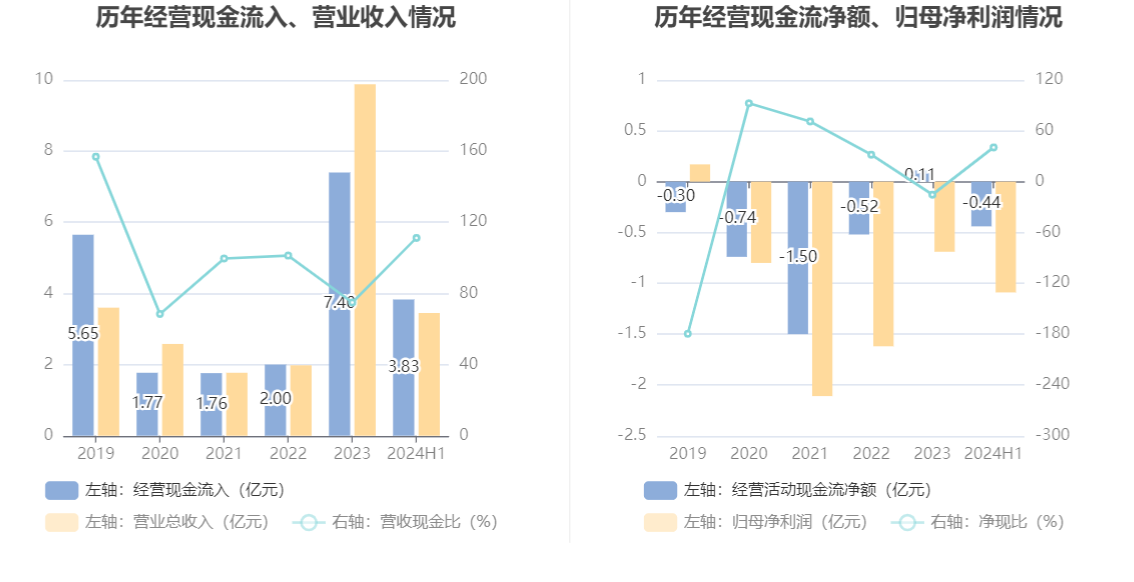 2024年上半年,公司经营活动现金流净额为-4424.28万元,同比增加1.48亿元;筹资活动现金流净额7090.57万元,同比减少2.18亿元;投资活动现金流净额-6642.94万元,上年同期为-2.7亿元。