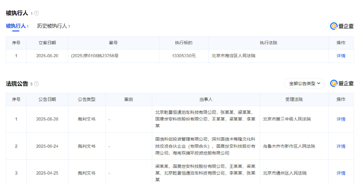 工商注册平台显示,2025年8月20日,北京市海淀区人民法院将国晟科技列入“被执行人”名单,执行案号为(2025)京0108执23756号,执行标的13305330元。