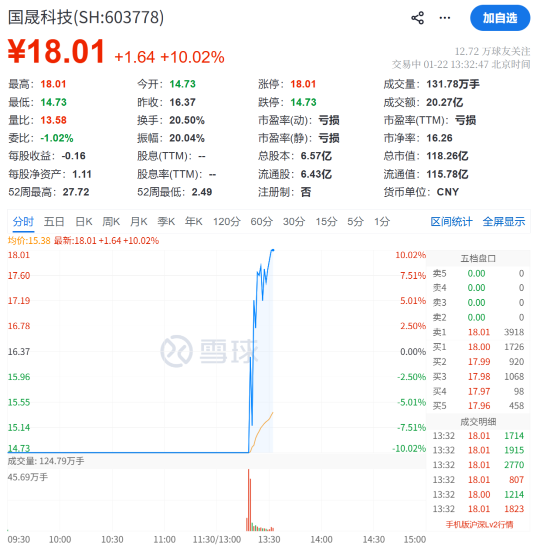 1月22日,跨年“妖王”国晟科技开盘继续跌停,股价报14.73元/股,上午卖一封单超百万手。