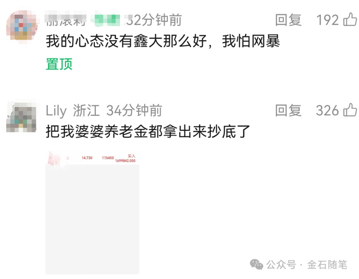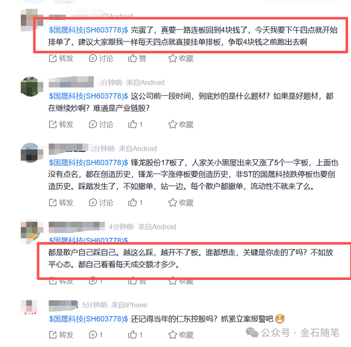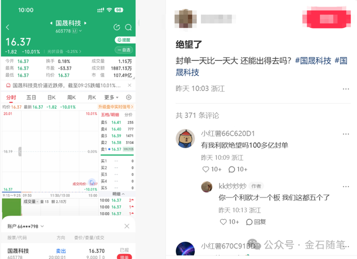 对于国晟科技地天板,多个因素在发酵。最为关键的是小作文发威:一位备注为lily的股民表示:把我婆婆养老金都拿出来抄底了。可谓噱头十足,截图显示,跌停板买了170万。