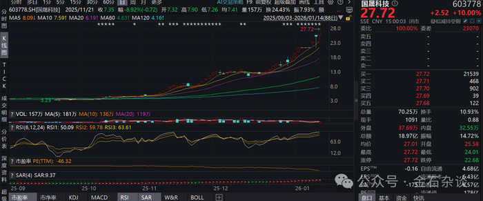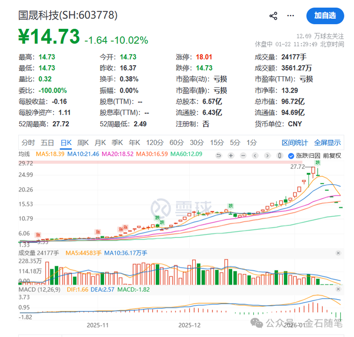 1月22日,国晟科技再度刷屏,这只股票在1月12日停牌核查后复牌,无视监管,继续狂涨,13日更是涨停,来到了27.72元的最高价。